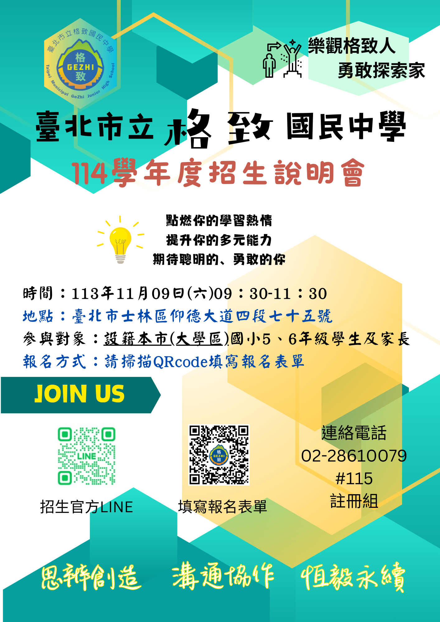一、臺北市立格致國民中學為臺北市第一所公立雙語實驗課程國中,以全人發展 的教育理念為核心,以思辨創造、溝通協作、恆毅永續為辦學主軸,並繼續研發且實施雙語課程及陽明山校本課 程,期望能提升學生學習表現,讓孩子天賦自由,培養其潛能,塑造美善人格,創造亮麗的未來人生。