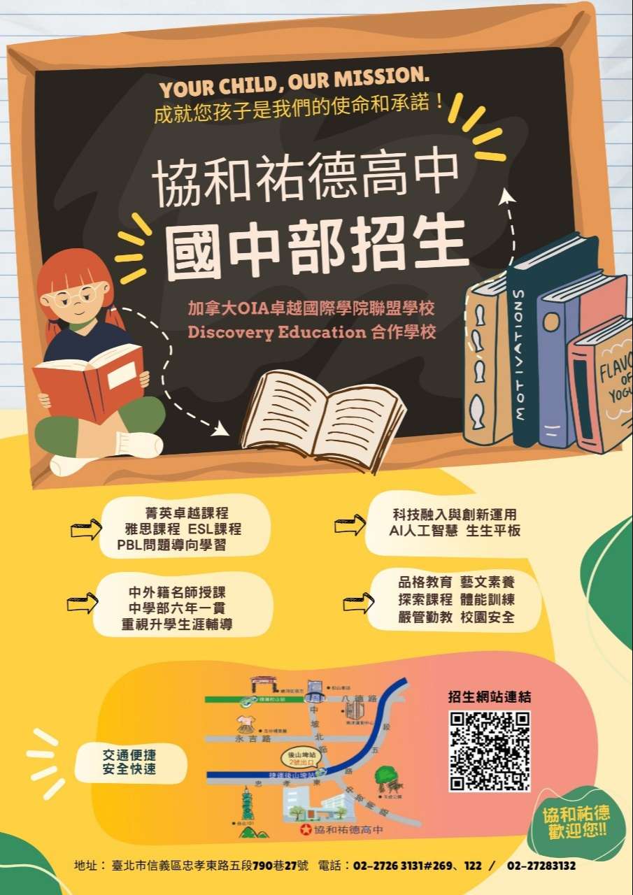 一、臺北市協和祐德高級中等學校於114學年度將招收國中部七年級學生兩班共80人,特於10月-12月,為家有四五六年級生之家長辦理多場招生說明會,詳細說明招收國中部之教育理念、辦學願景及課程特色…等,歡迎關心孩子教育的家長踴躍報名。