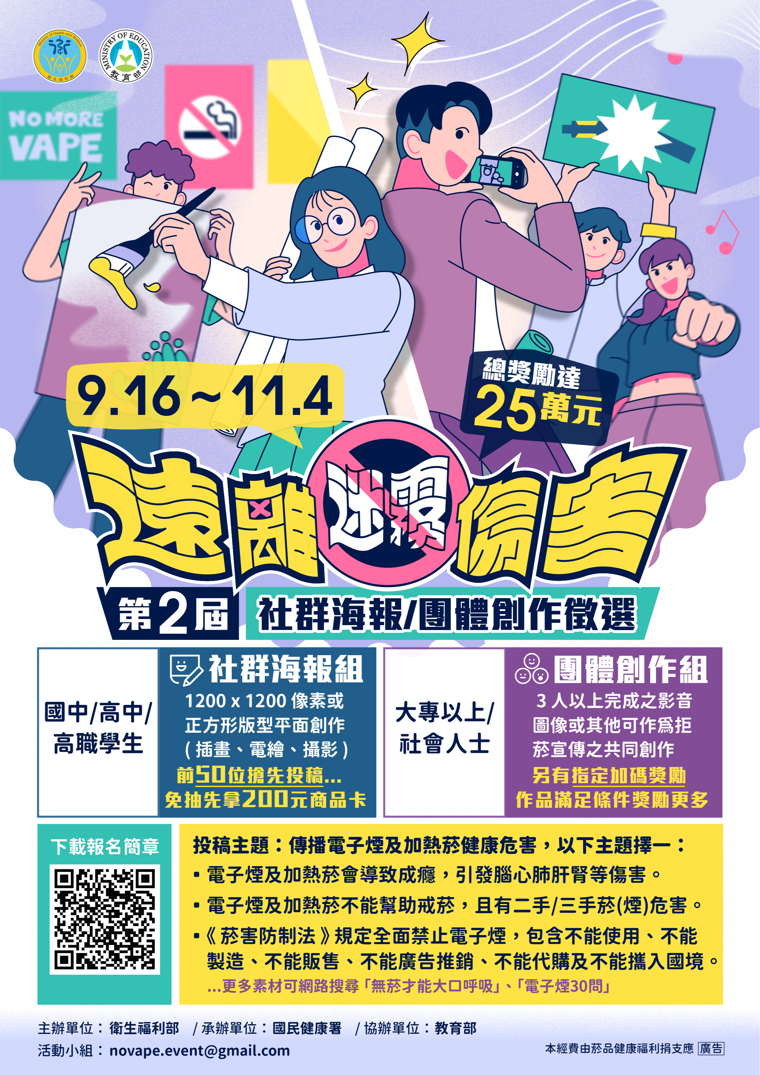 一、為避免電子煙、加熱式菸品等新興菸品入侵校園,造成健 康危害,衛生福利部(承辦單位:衛生福利部國民健康 署)爰與教育部共同辦理旨揭活動(徵選簡章如附件1、活 動海報如附件2),以宣導電子煙及加熱式菸品等新類型菸 品之危害,共同維護青少年健康。活動相關內容如下: