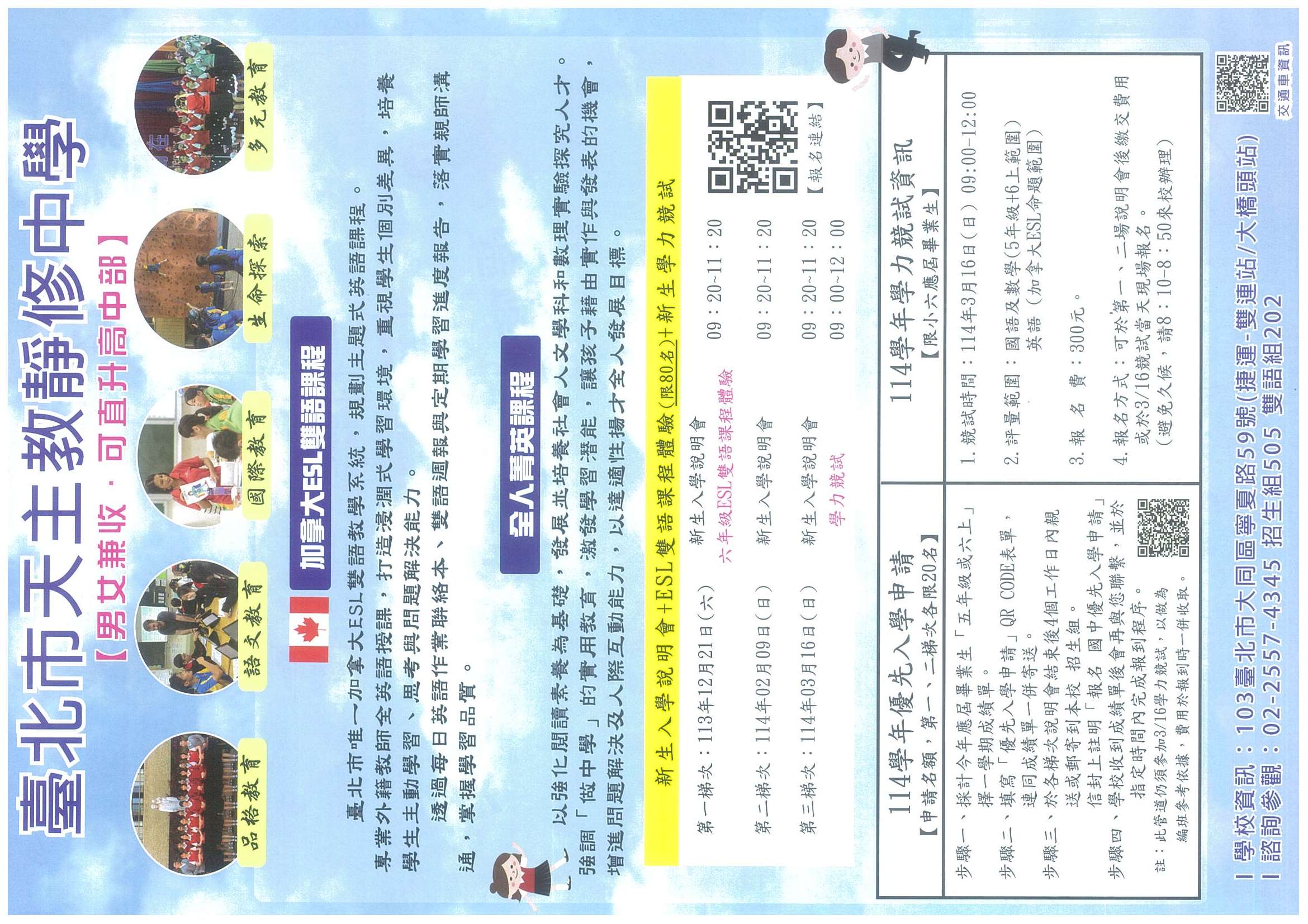 一、為使家長與學生充分了解臺北市私立靜修中學國中部加拿大雙語課程、全人菁英課程之入學資訊,舉辦招生說明會,如下列,並鼓勵對課程有興趣之親師生參加。 (一) 第一場說明會與六年級ESL雙語課程體驗:113年12月21 日(六)上午09:20-11:20。