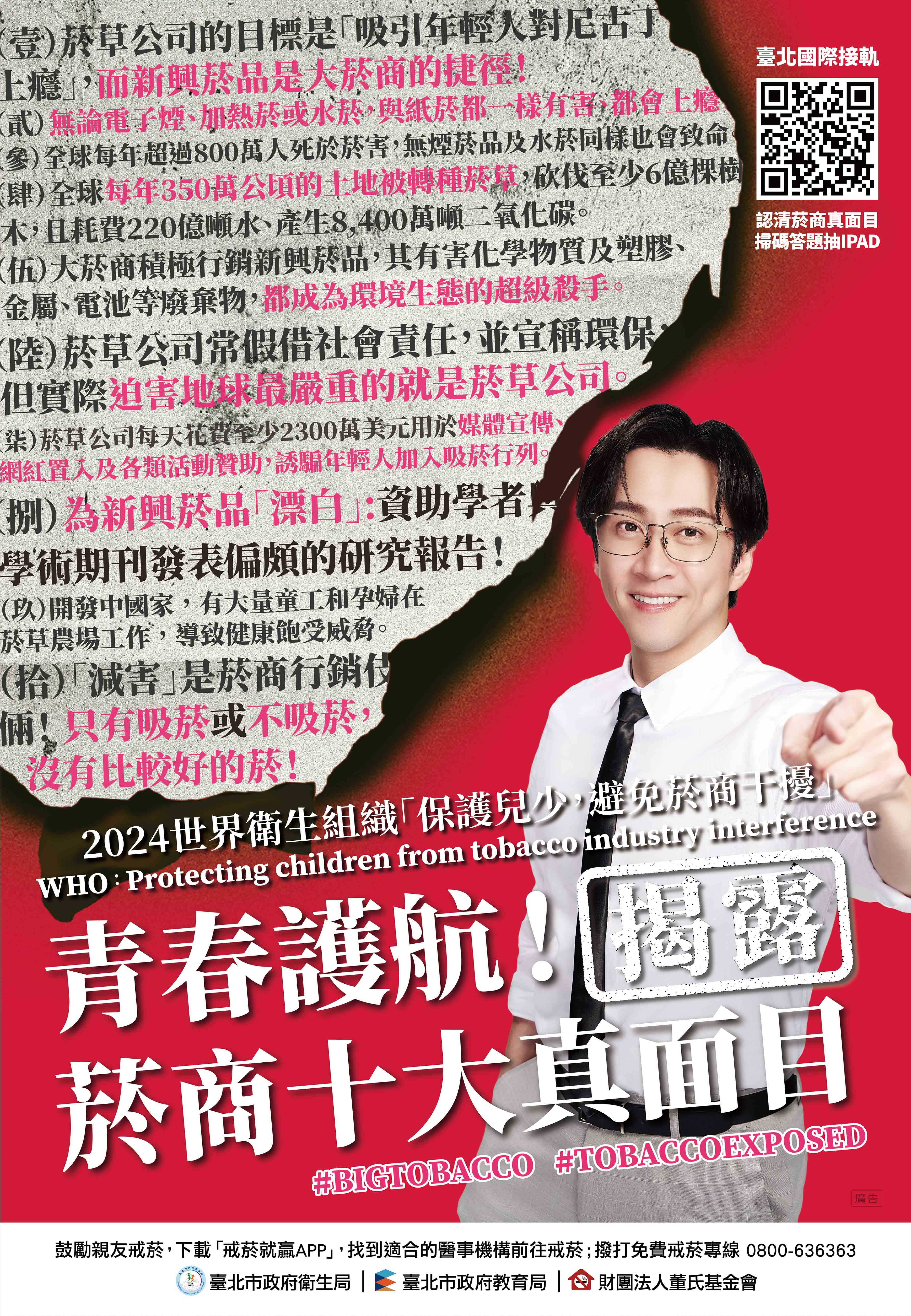 世界衛生組織(WHO)2024年菸害防制主軸為「揭露菸商真面目:保護兒少,避免菸商干擾」。為提升本市高中職以下學校學生拒菸認知及瞭解菸害防制新法內容、菸品及新興菸品危害,財團法人董氏基金會製作旨揭兩支宣導短片。另,檢送「菸害偵探社」學習單(教師版、學生版如附件)1份,歡迎參考運用。