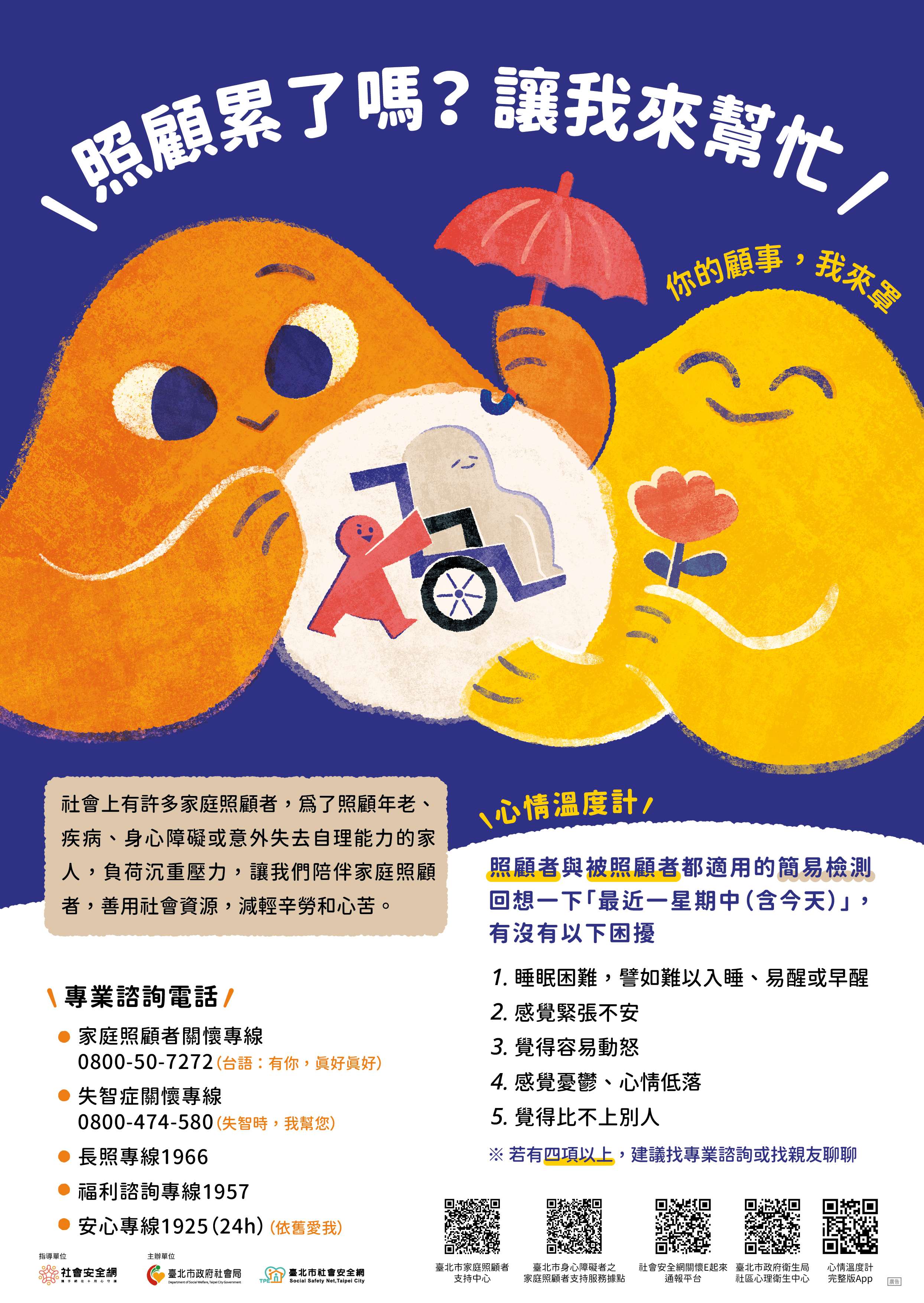 二、為關注「家庭照顧者」心理健康及需求,推廣社區友善互 助及長期照顧資源,強化本市超高齡社會支持韌性,爰製作旨揭宣導海報及摺頁文宣,如附件1、2。