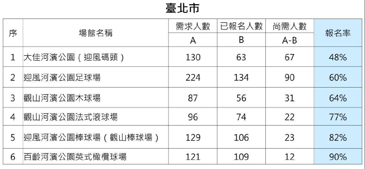二、旨揭賽會本市共有28個賽館,尚有6個場館尚有志工缺額,請各單位積極轉知所屬人員及家眷踴躍報名擔任志工參與盛會。 三、檢附本市尚需招募志工之場館一覽表1份。