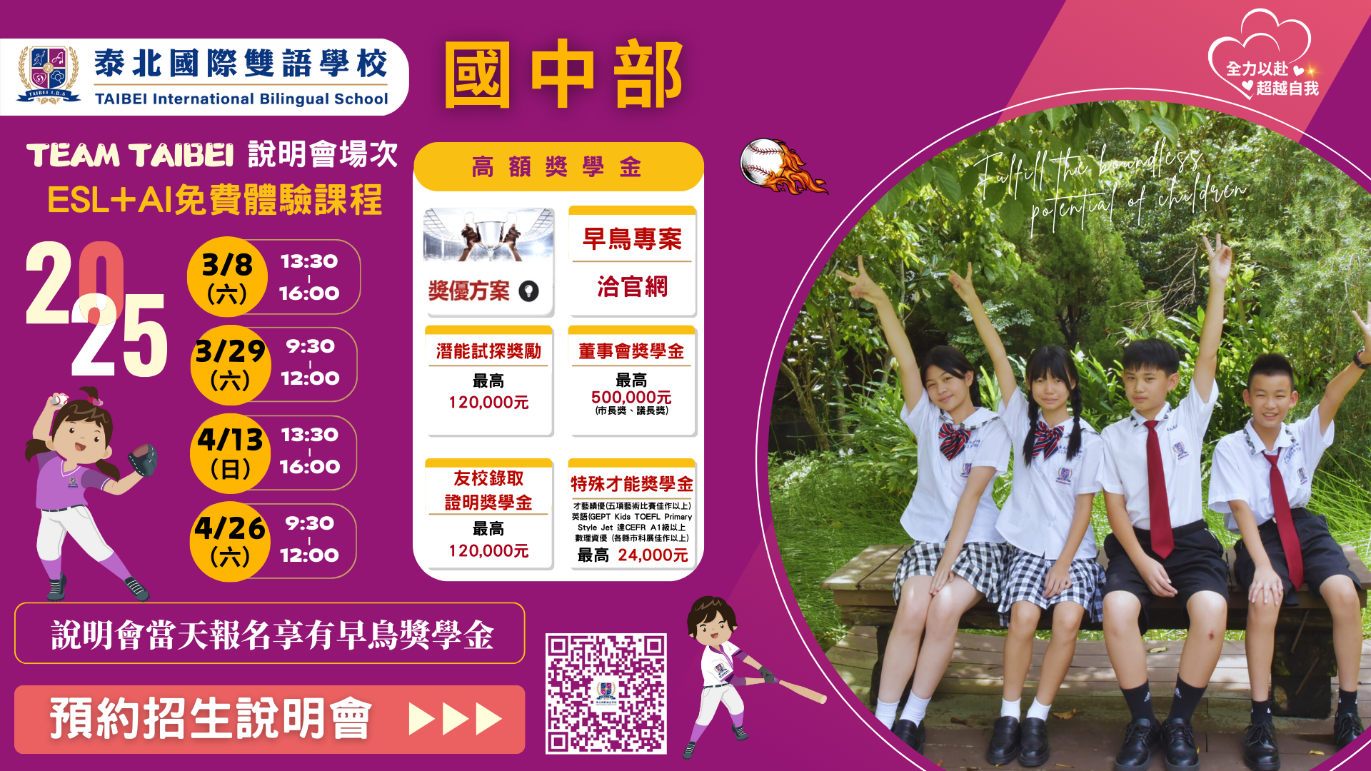 主旨:臺北市泰北高中謹訂於114年3月29日(星期六)9:00-16:00舉辦雙語國中部新生潛能試探活動,鼓勵學生及家長踴躍參與。