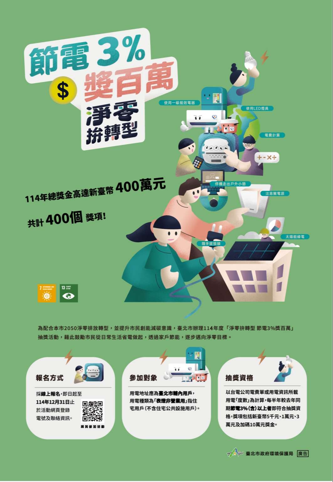 為鼓勵市民落實節能減碳行動,本局114年「淨零拚轉型節電3%獎百萬」抽獎活動,即日起至114年12月31日辦理。