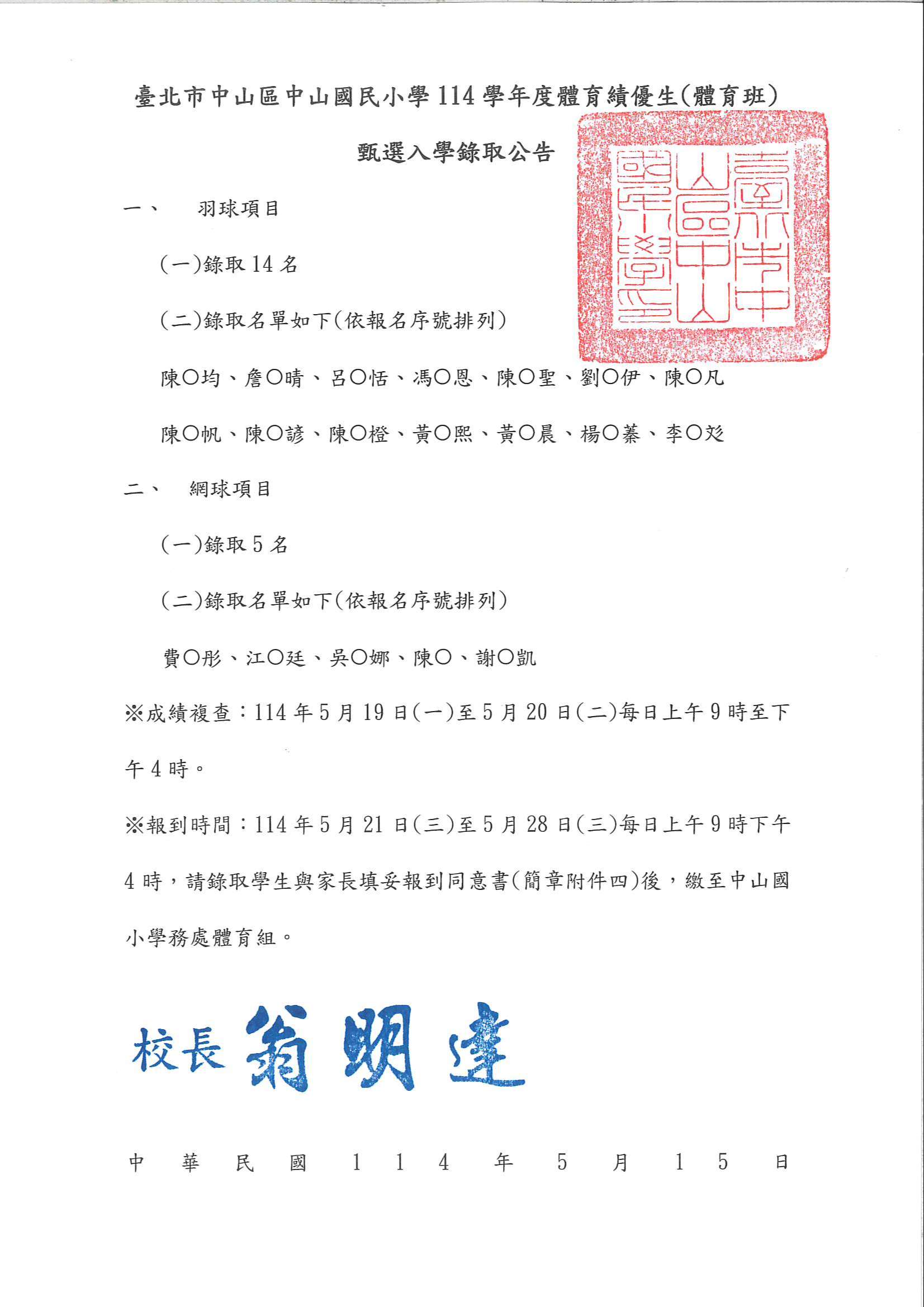 臺北市中山區中山國民小學114學年度體育績優生(體育班)甄選入學錄取公告,如附件。