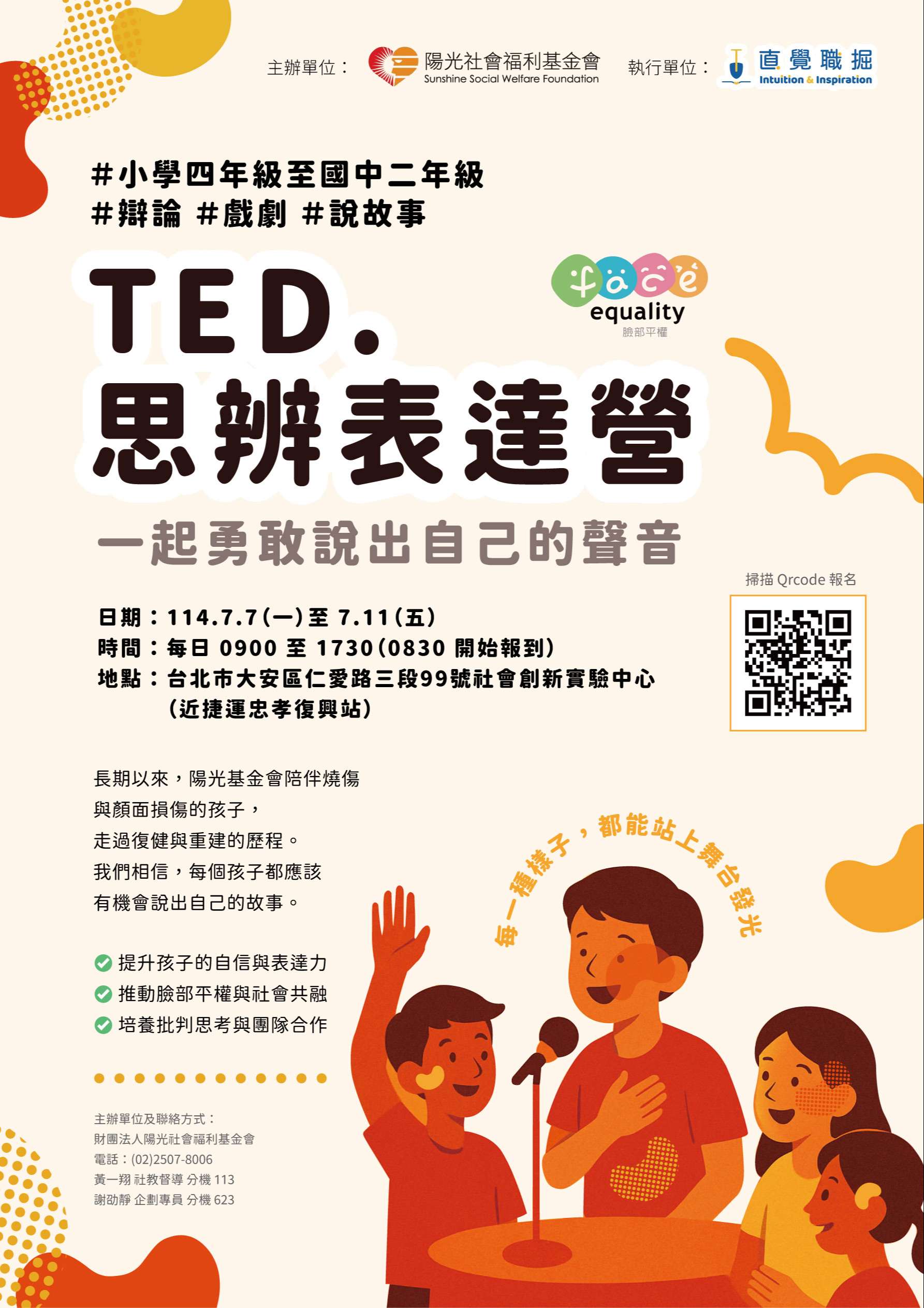 主旨:陽光社福基金會舉辦「盛夏OPEN MIND 表達OPEN MIC---TED.思辨表達營」活動,結合思辨表達與戲劇教育,推動臉部平權理 念,鼓勵學生踴躍報名參加。