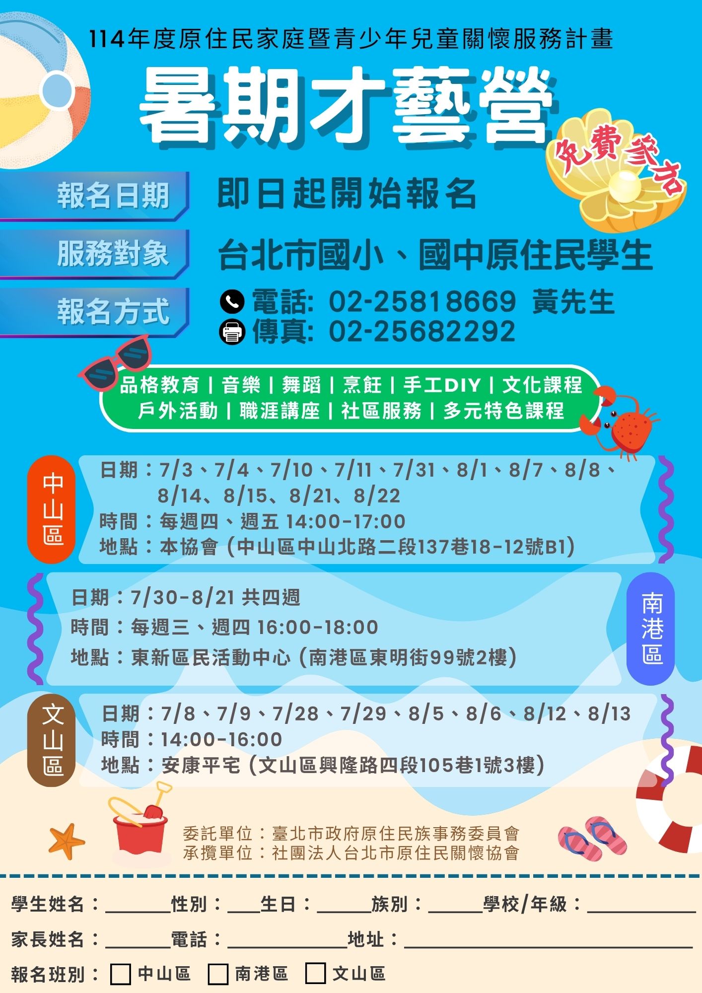 台北市原住民關懷協會在暑假期間針對原住民學生開辦暑期才藝營,課程免費參加。附上活動宣傳單如附件,歡迎原住民學生踴躍參加!