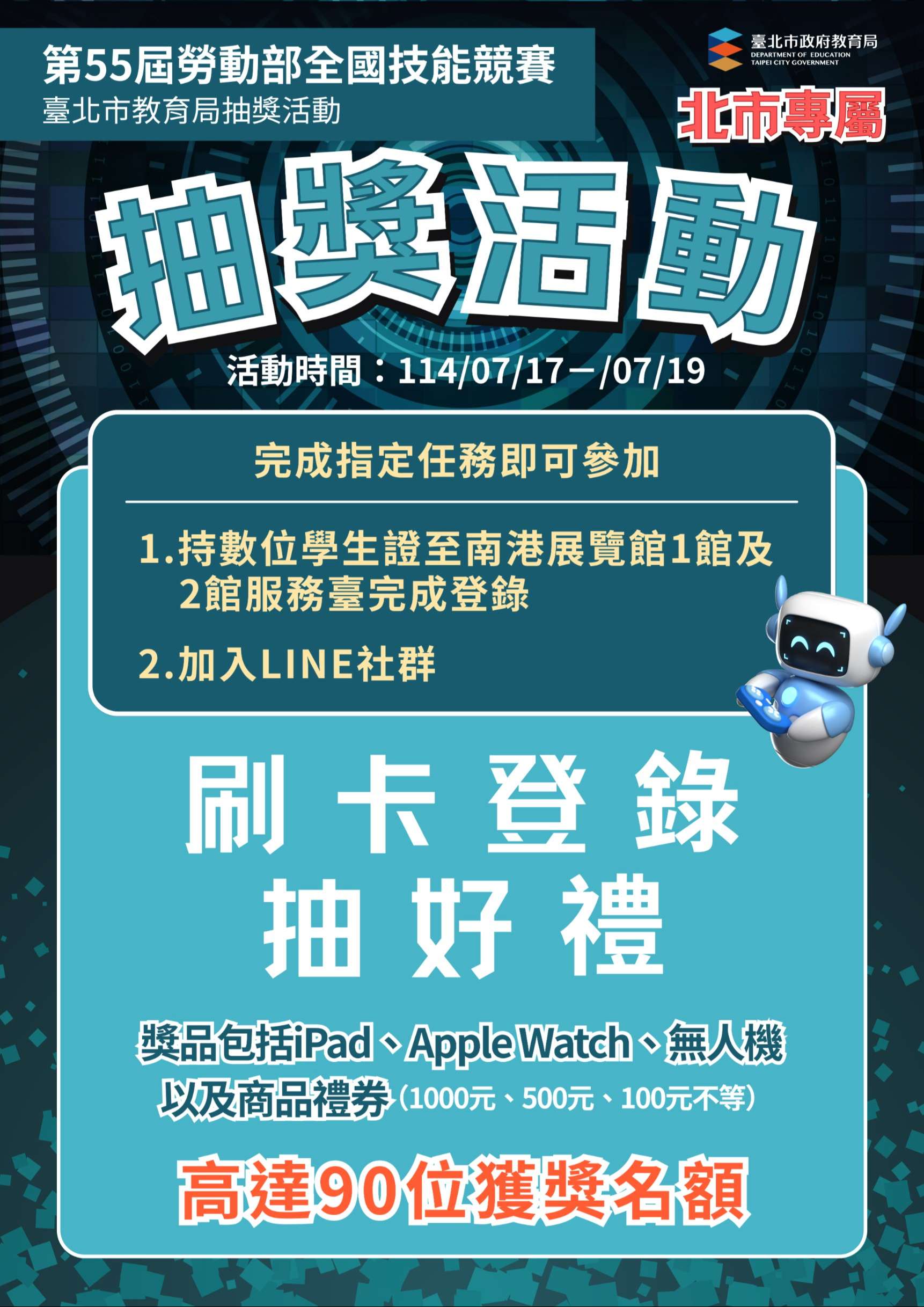 四、現場提供本市學生限定好禮抽獎活動,凡本市各級學校學 生持數位學生證至南港展覽館1館及2館,至大會服務臺完成登錄即可參加抽獎,獎品包括平板電腦、智慧手錶、無人機、以及商品禮券(1000元、500元、100元不等),高 達90位獲獎名額。