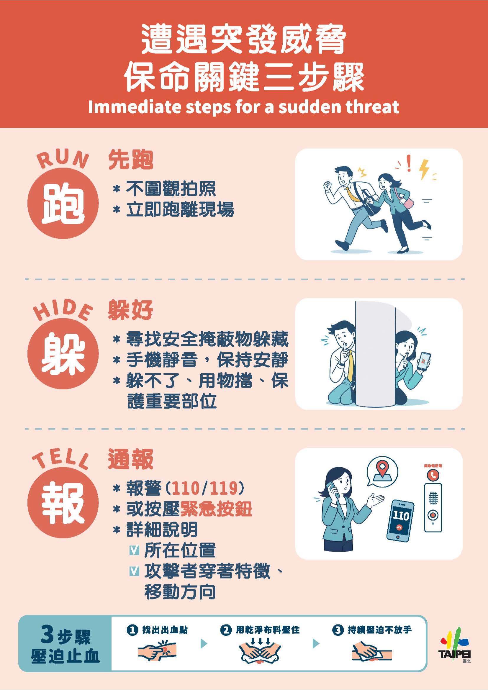 提醒民眾如遇突發威脅,得依指引儘速躲避並隨時留意周邊狀況,確保自身安全。