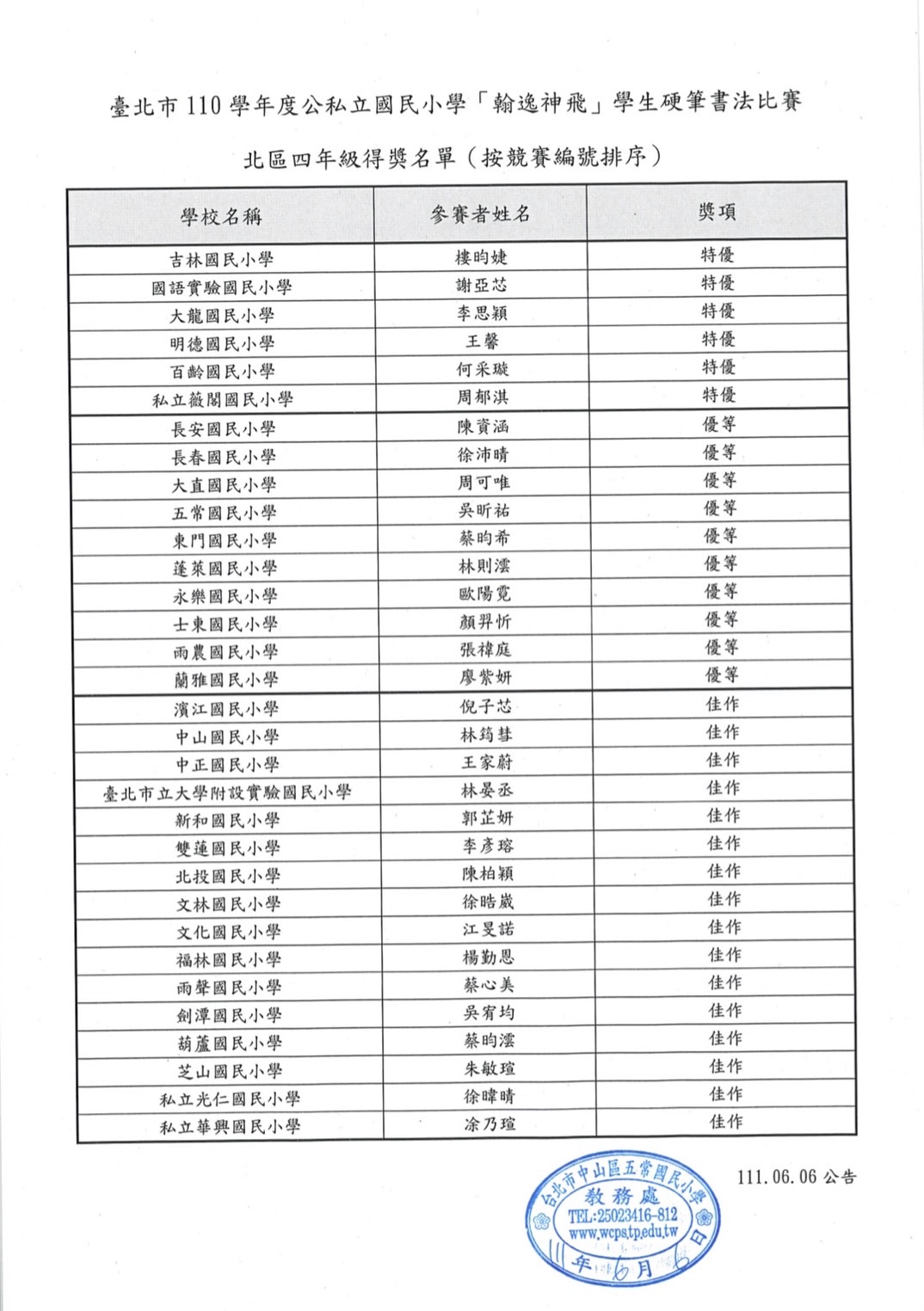 本校402林筠彗同學參加臺北市110學年度【翰逸神飛】學生硬筆書法比賽,