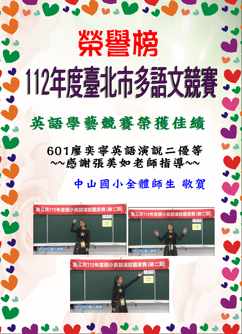 恭喜本校學生601廖奕寧,參加臺北市112年度英語學藝競賽北區【英語演說二】決賽,榮獲優等佳績!