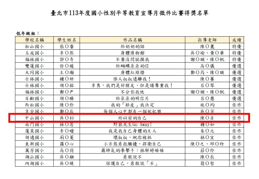 賀!恭喜本校二年4班吳祤杉參加臺北市113年度國小性別平等教育宣導月